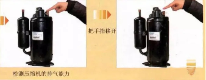 用手指按住吸氣管,若感覺到有吸氣壓力, 則表示壓縮機正常。當把手指移開時, 如果沒有感覺到任何吸力,說明壓縮機沒有吸氣能力。如下圖所示: