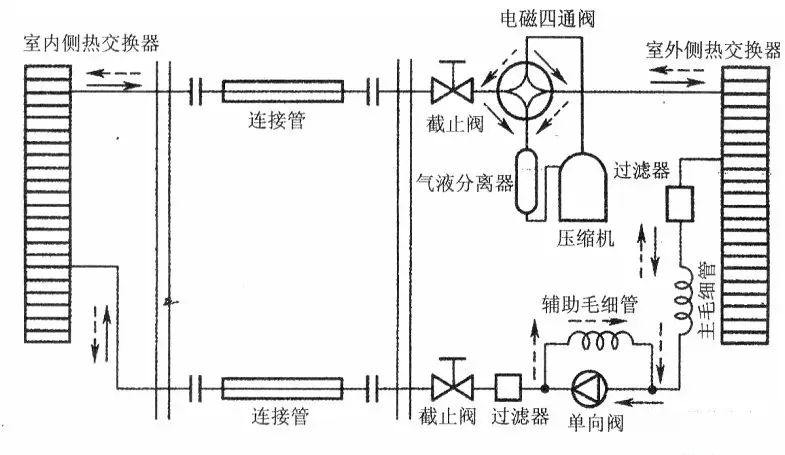 3、 熱泵系統 。與單冷系統情況相同,熱泵運行是否正常,主要檢查四通換向閥的工作情況。換向閥換向時,可聽到有比較響的氣體流動聲以及電磁閥頂針的撞擊聲(電磁場吸動閥心),當電磁閥在換向過程中聽不到上述兩種聲音,那電磁閥可能出故障。